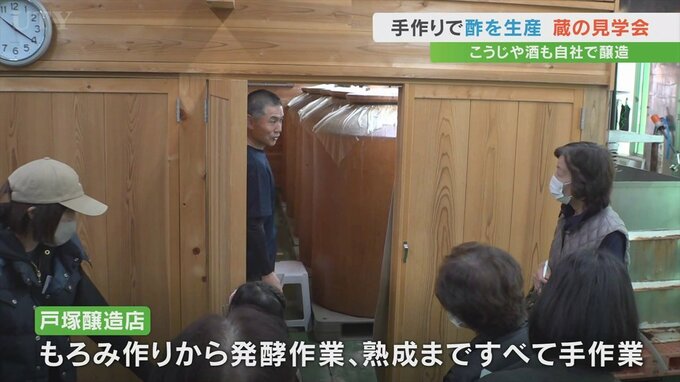 昔ながらの手作りで酢を生産する山梨県都留市の醸造所で蔵の見学会が開かれました。
