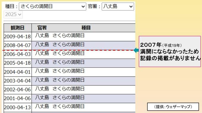 暖冬の影響で八丈島の測候所(現在は桜の観測は行っていない)の桜の標本木はだらだら咲き、いつ見ても約2割程度しか咲いておらずそのまま散ってしまいました。1953年の統計開始以来初めて「2007年、さくらの満開は観測できず」という事態になったのです。