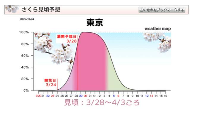 ついに「さくら」開花!いつが見頃?お花見に適した日はいつ?【お天気タイムマシン】 TBSテレビ 2025年3月24日(月) 17:11 国内 天気 萩原 喬子 ウェザーマップの今年の満開予想は? 今年のウェザーマップの満開予想は3月28日。 気象予報士 森朗氏: 今年の桜は満開までは早そうです。ただその後、週末は気温が下がりそうなので長持ちしそうです。 2025年の見頃は3月28日~4月3日ごろになりそうです。(提供:ウェザーマップ)