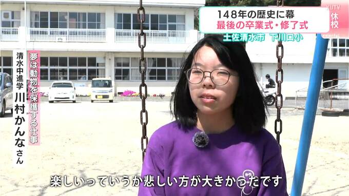 「終わってほしくないなぁって。楽しいっていうか悲しいほうが大きかったです。最後やけん締めくくりをよくせないかんなぁと思って。(Q.新しい学校で楽しみなことは?)授業が少し変わるのが楽しみです。算数が数学に変わって(答えが)マイナスになる計算とかあるので。(Q.勉強が難しくなるけど不安じゃない?)はい、楽しみです」