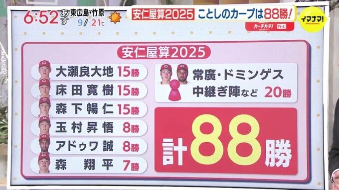 ここまでは、大瀬良投手、床田投手、森下投手がそれぞれ15勝。3本柱で45勝を積み重ねています。