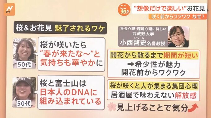 社会心理・環境心理に詳しい武蔵野大学・小西啓史名誉教授は「開花から散るまでの期間が短いので、希少性が魅力。開花前からワクワクも大きくなる」ということです。