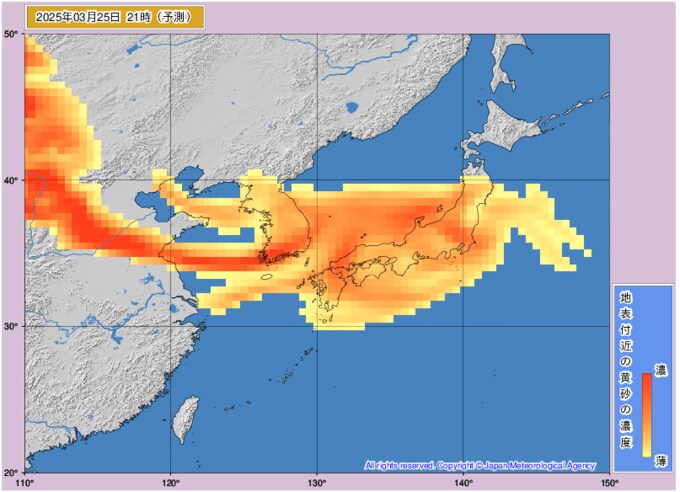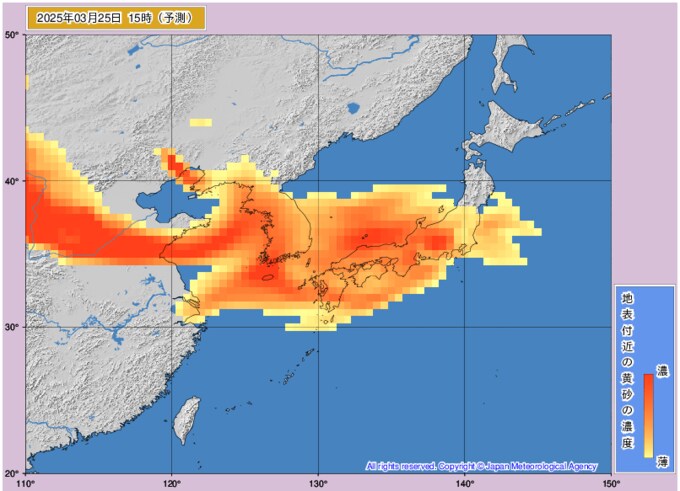 黄砂情報 25日~26日にかけて北日本から西日本の広い範囲で黄砂飛来 視界が10キロメートル未満に 気象庁発表 テレビユー山形 2025年3月25日(火) 11:06 国内 ■いつ黄砂が来るのかは画像で ※27日までのシミュレーション