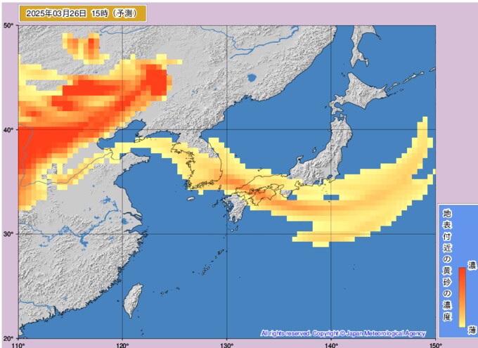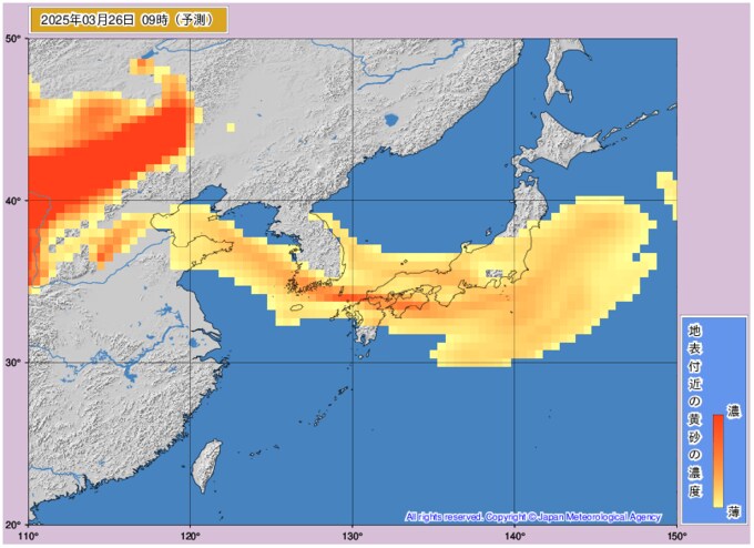 黄砂情報 25日~26日にかけて北日本から西日本の広い範囲で黄砂飛来 視界が10キロメートル未満に 気象庁発表
