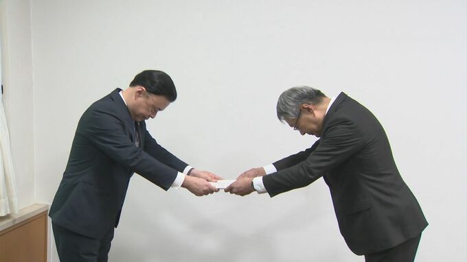 島根県庁を訪れた中国電力の中川社長に、設置の了解を伝えた丸山知事。