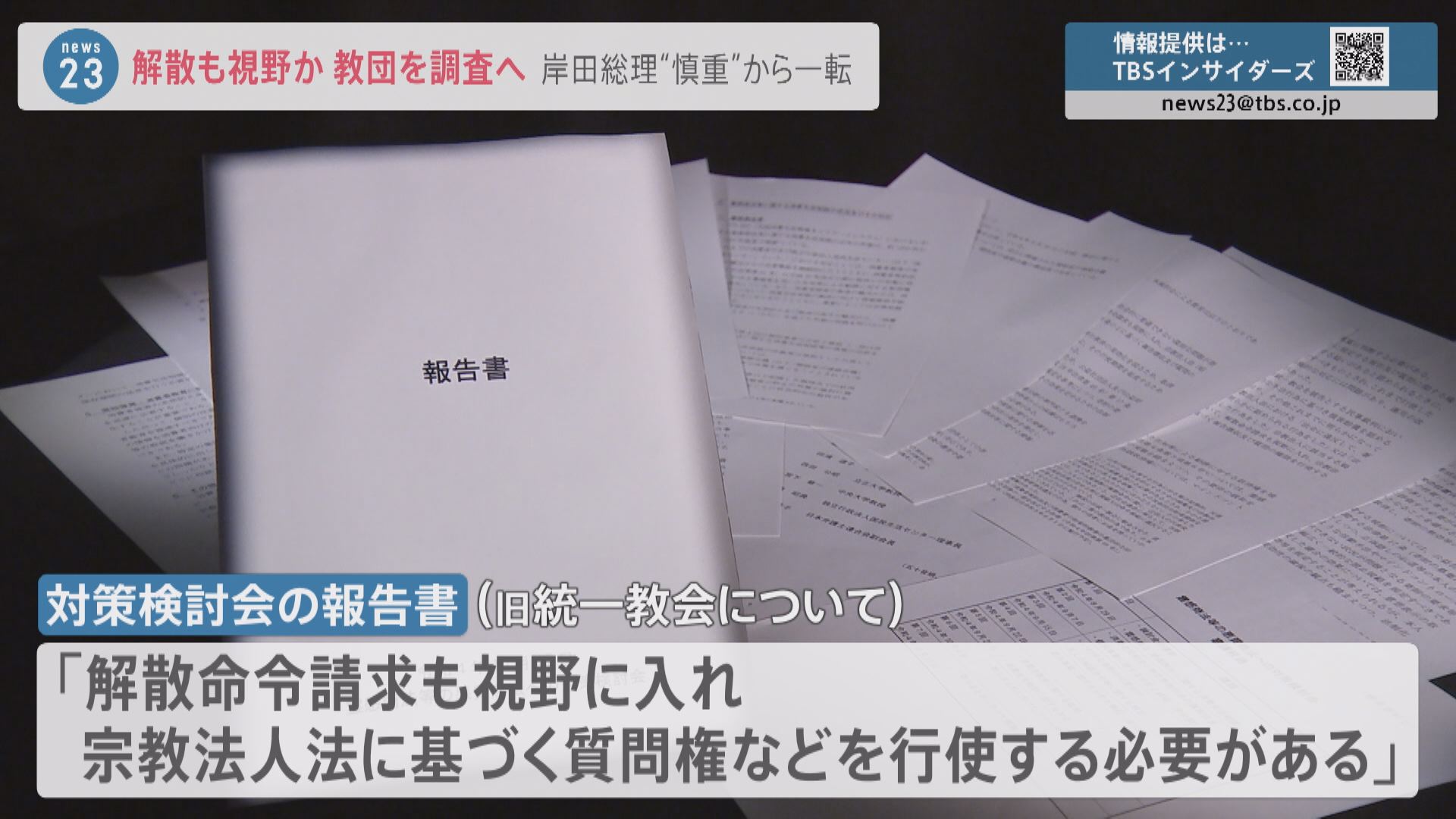 消費者庁が設置した対策検討会がまとめた報告書では、旧統一教会について、「解散命令請求も視野に入れ、宗教法人法に基づく質問権などを行使する必要がある」と提言しています。