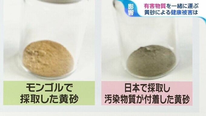 実際、モンゴルで採取した黄砂と日本で採取した汚染物質が付着した黄砂を比べてみると、 黒っぽく変色しているのがわかります。