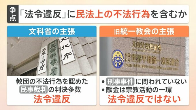 文科省は、教団の不法行為を認めた民事裁判の判決が多数あり、「法令違反」と主張しました。一方、旧統一教会は、刑事事件には問われておらず、献金は宗教活動の一環であることから、「法令違反にはあたらない」と主張し、双方の主張は対立していました。
