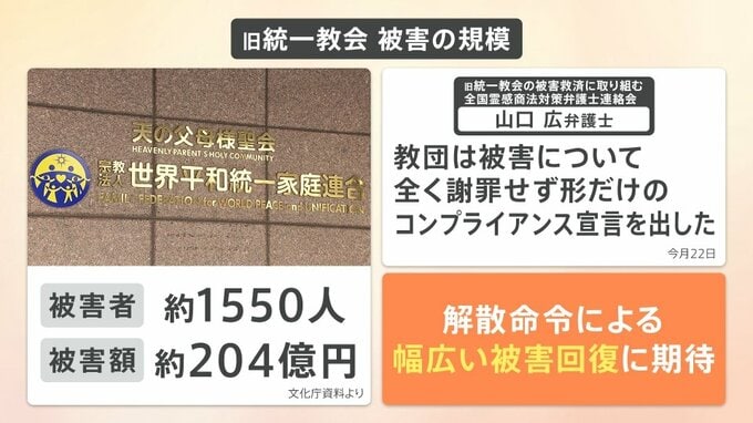 旧統一教会の被害救済に取り組む、全国霊感商法対策弁護士連絡会の山口広弁護士は3月22日に「教団は被害について全く謝罪せず、形だけのコンプライアンス宣言を出した」と批判。今回の解散命令による幅広い被害回復に期待をするとしています。