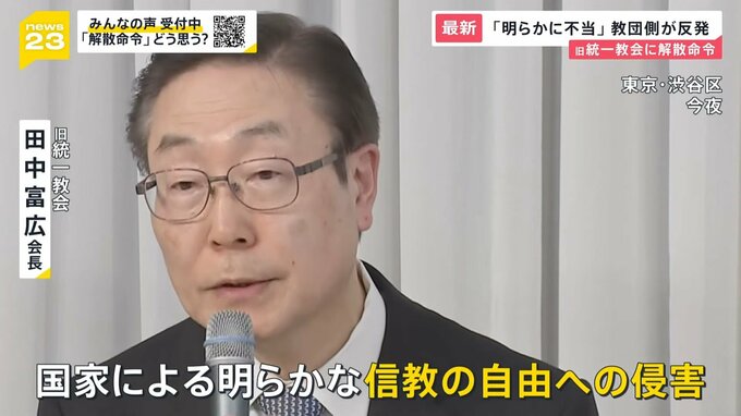 高額献金などが問題になっていた旧統一教会。東京地裁が解散命令を出しました。解散命令を受けて、教団側は25日夜、会長らがおよそ1時間半にわたって会見し、証拠となる被害者の陳述書を「文科省がねつ造した」などと主張。猛反発しています。