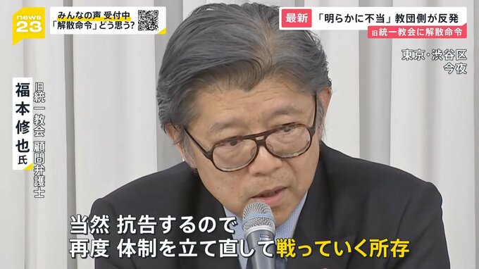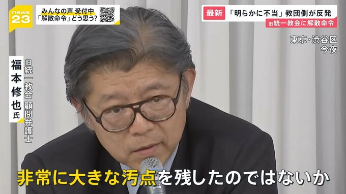 東京地裁が解散命令を出したのは、25日午後3時ごろ。やがて裁判所から姿を見せた旧統一教会の福本弁護士は、記者の質問にこう答えました。