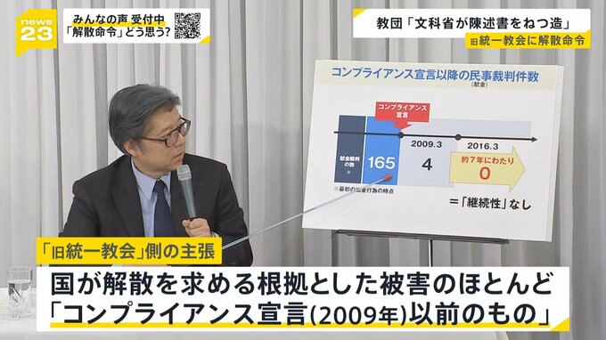 一方、25日夜の会見で旧統一教会側は「国が解散を求める根拠とした被害のほとんどが、教団が法令遵守を掲げた2009年のコンプライアンス宣言以前のもの」だと主張。さらに…