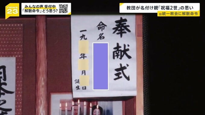 生後10日、両親に抱かれて映る写真には、教祖夫妻の写真が飾られた祭壇に掲げられた「奉献式」の文字。生まれた子どもを神様に捧げる儀式で、名前も教団がつけました。