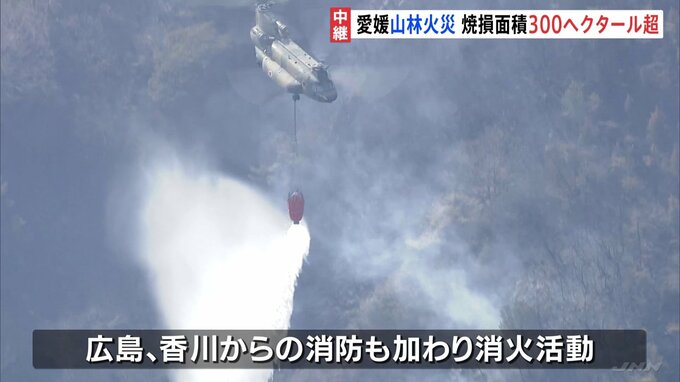 愛媛県今治市の山林火災は、発生から4日目を迎えますが、依然として延焼が続いていて、焼損面積は300ヘクタールを超えました。現場から中継です。愛媛県今治市です。けさになり火災の中心は画面右に見える比較的標…