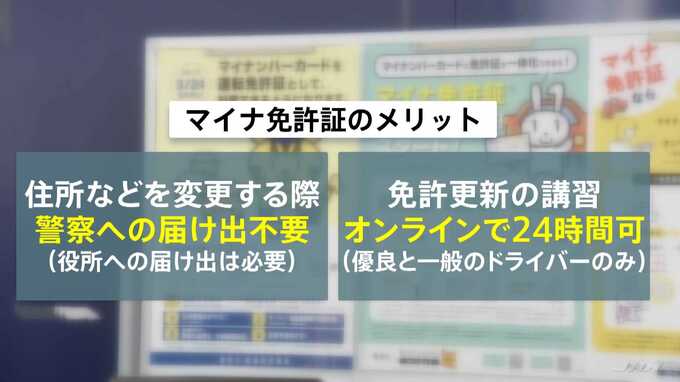 「マイナ免許証」では、住所などの変更手続きをする際役所に変更を届け出れば警察への届け出が不要になるほか、優良と一般のドライバーは免許更新の講習をオンラインで24時間受けられるようになります。