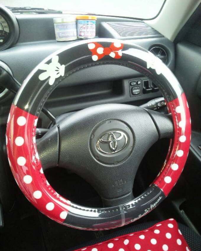 投稿された画像では、ネイビーの車体の外観と、ミニーちゃん仕様にデコレーションされた車のハンドルの様子が見て取れます。