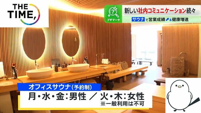 〔月水金〕⇒男性社員・〔火木〕⇒女性社員となっていて、予約すれば誰でも利用OK。毎週水曜日は「サウナ会」も実施し、社長と社員が近所のラーメン店について熱く語るなんてことも。(※一般利用は不可)