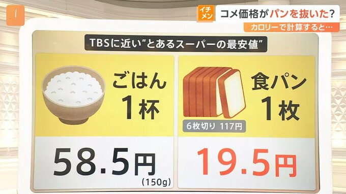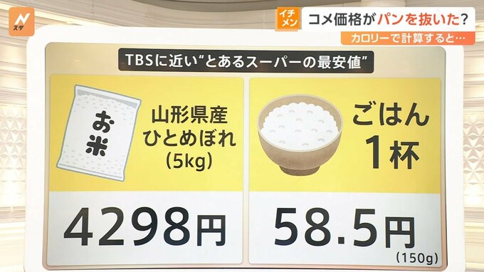 TBSに近い赤坂の“とあるスーパー”の最安値は、山形県産のひとめぼれ(5㎏)4298円でした。ごはん一杯(150g)に換算すると58.5円です。ごはん1杯につき60円と思うと意外と高いなと感じる人もいるかもしれません。