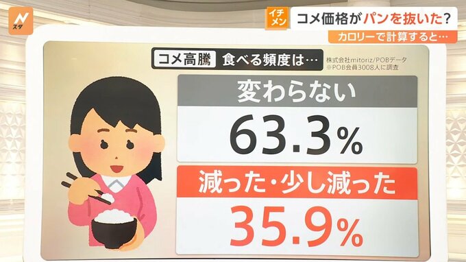コメ高騰で食べる頻度が「変わらない」と答えた人は63.3%、「減った、少し減った」と答えた人は35.9%となっています。(株式会社mitoriz/POBデータ ※POB会員3008人に調査)