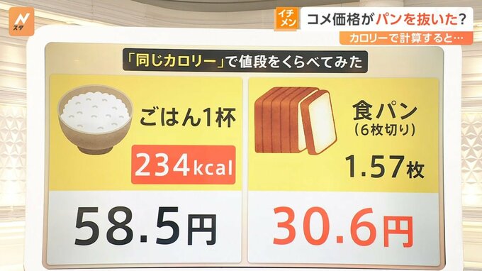 ごはん一杯(150g)は234kcalです。食パンで同じカロリーを取ろうとすると、6枚切り1.57枚で30.6円です。同じカロリーで比べてみても、食パンよりごはん一杯の方が割高になる計算になります。