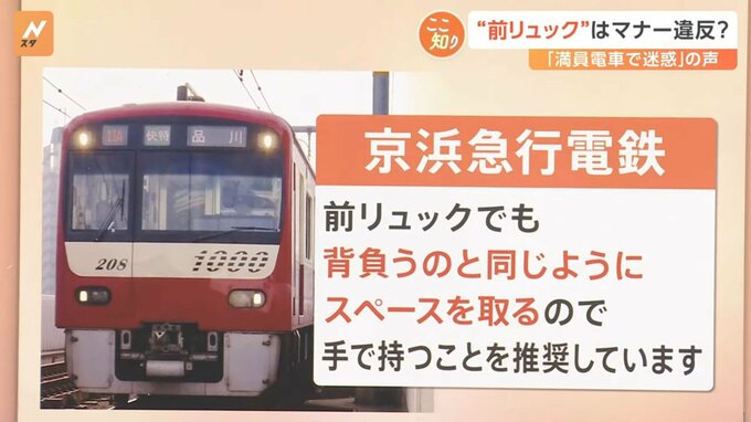 京浜急行電鉄に聞いたところ、「前リュックでも背負うのと同じようにスペースを取るので、手で持つことを推奨しています」ということです。