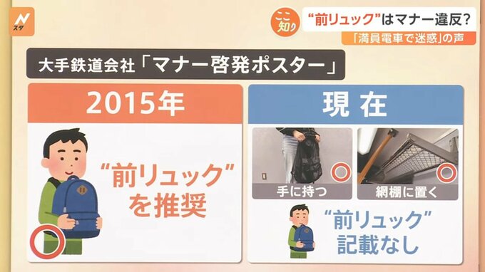 その啓発も変化しているようです。大手鉄道会社の「マナー啓発ポスター」をみると、2015年は“前リュック”を推奨していました。