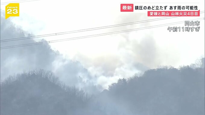 火災発生から4日目になる岡山県南部の山林火災。こちらも延焼が続いていて、鎮圧のめどは立っていません。26日午後7時時点で、焼損面積はおよそ559ヘクタール。岡山県では、過去最大規模の被害になる見通しです。