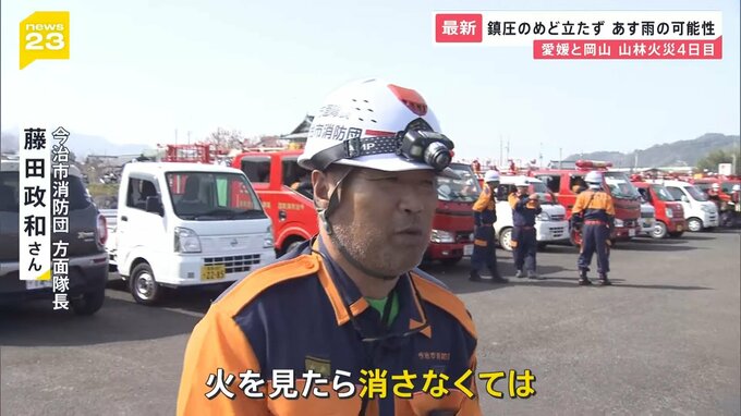 今治市は、27日昼すぎから弱い雨が降り始め、深夜には、まとまった雨になる可能性があり、火災の収束が期待されます。