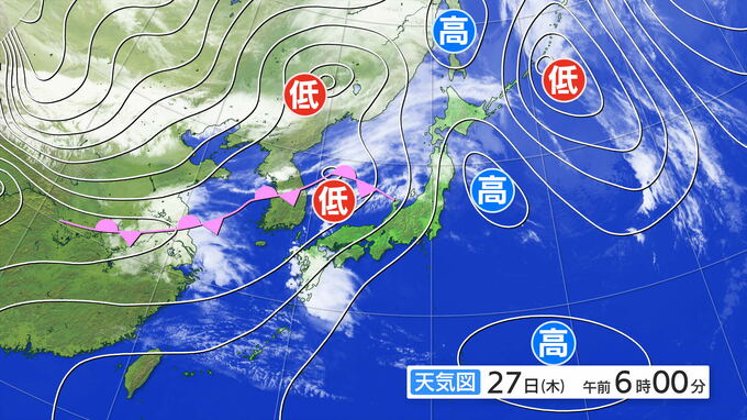 27日(木)は西日本中心に大気の状態非常に不安定で雨強まるところも 夜にかけては北陸や東北などでも雨に 雨と風の予想シミュレーション 北陸放送 2025年3月27日(木) 10:05 国内 27日(木)は低気圧や南から暖かく湿った空気が流れ込む影響で、昼前から昼過ぎにかけては九州や中国・四国など西日本で、夜にかけては東日本や北日本で雨が降る見込みです。急な強い雨が降るところもあるでしょう。 27日午前6時の天気図です。日本海に前線をともなった低気圧があります。 27日(木)午前9時の天気図 日本の南東の海上にある高気圧周辺から暖かく湿った空気が流れ込み、九州など西日本では大気の状態が非常に不安定になり午前中から雨が降っています。