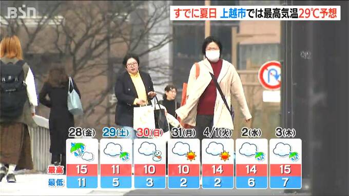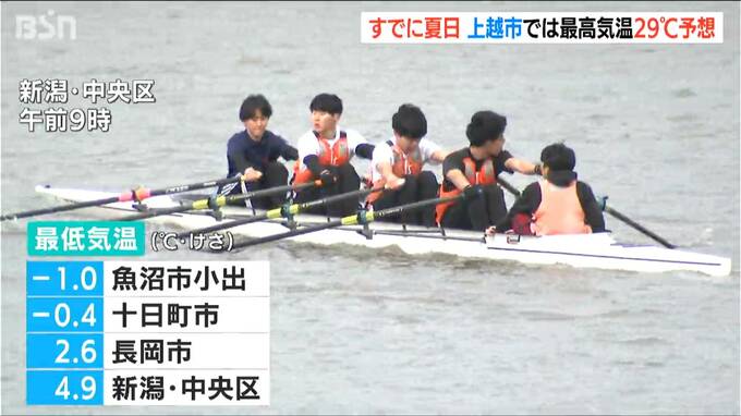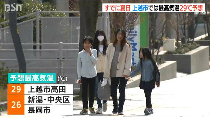 気温はこのあとさらに上がり、日中の最高気温は上越市 高田で29℃、新潟市 中央区と長岡市で26℃など、各地で6月並みになる見込みです。