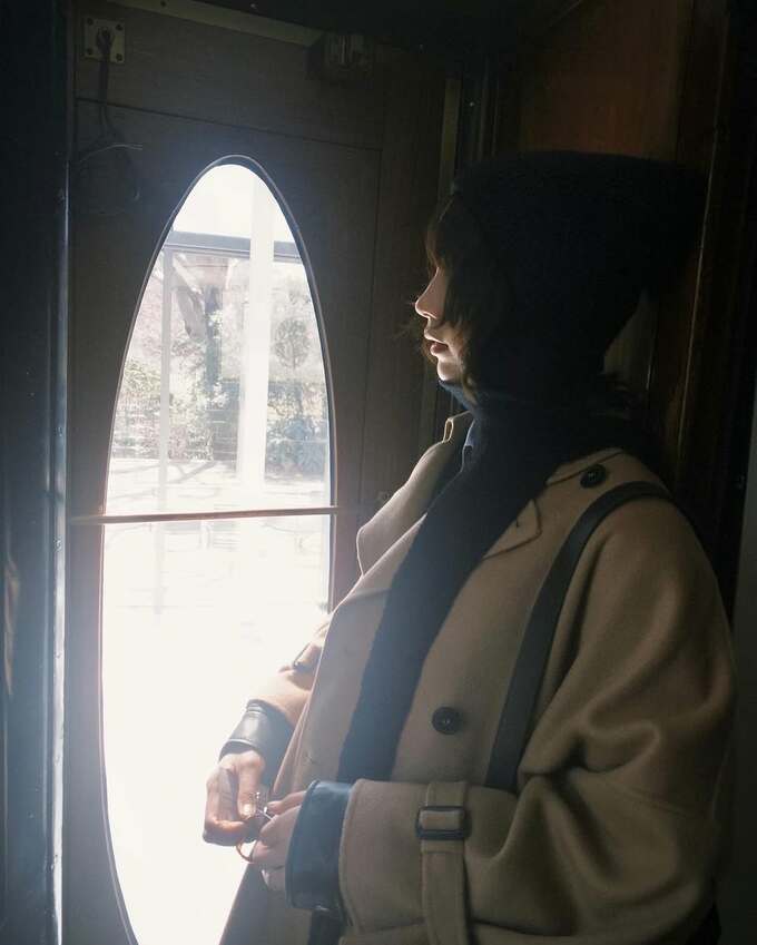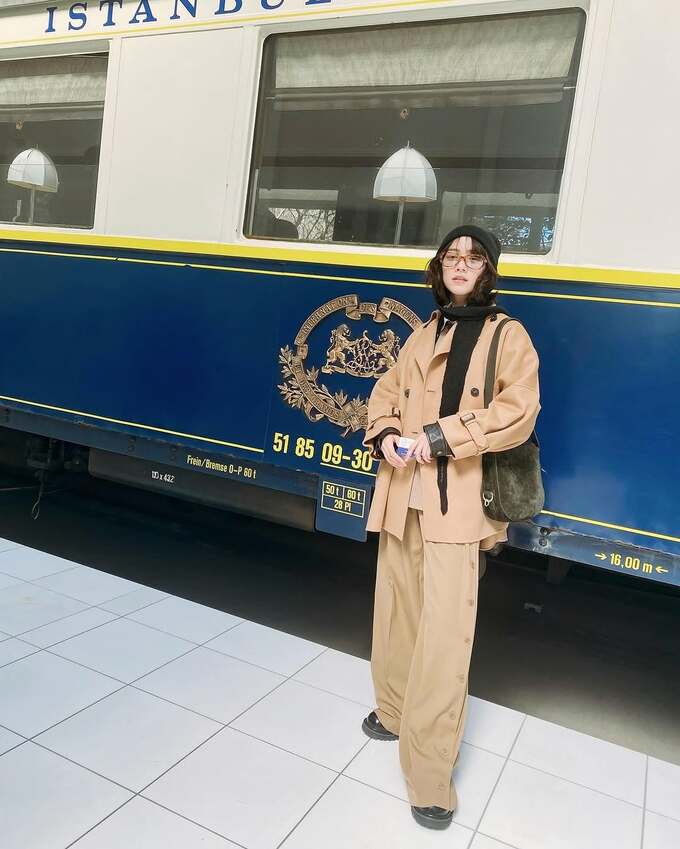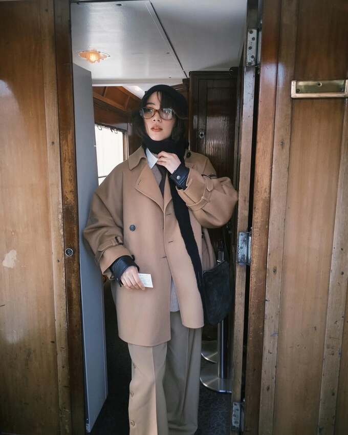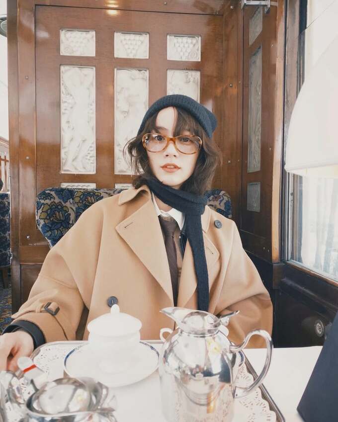 投稿された写真には、ベージュのコートに、黒いニット帽など、落ち着いた色調でコーディネートしたのんさんが、オリエント急行の車両に乗車する様子や、ほかの写真には、ベージュの丸首ニットにネクタイ姿でティータイムを楽しむ様子が写っています。