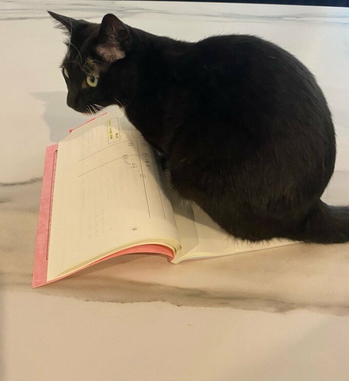 藤さんは、愛猫のマルの写真を投稿。マルは、藤さんが読もうとしている台本の上に正座して、まるで自身の定位置のクッションに座るかのように、何事も無いような平然とした表情をしています。