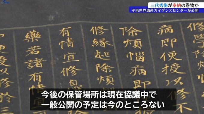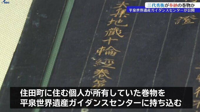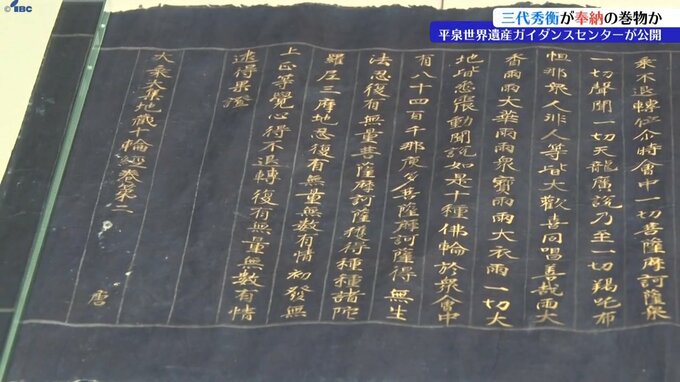 平泉世界遺産ガイダンスセンターは27日、奥州藤原氏の三代秀衡が中尊寺に奉納したものの一つである可能性が高いとする巻物を報道に公開しました。