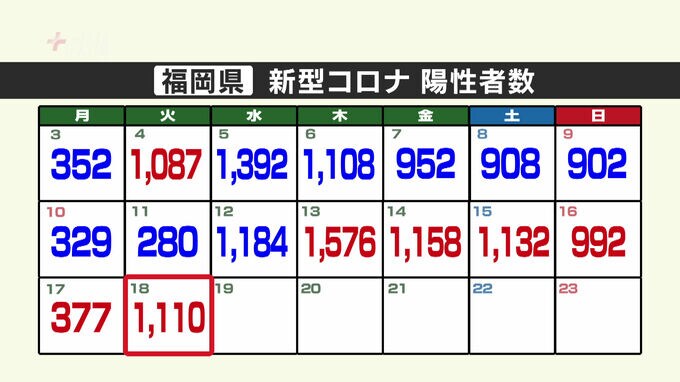 新型コロナの感染状況です。福岡県は18日、新たに1110人の陽性を発表しました。福岡県の一日ごとの陽性者数を示すカレンダーです。18日は1110人で、6日連続で前の週の同じ曜日を上回っています。…