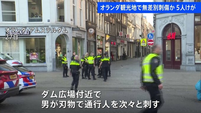オランダの観光地で、男が外国人ら5人を刺しました。27日、オランダの首都アムステルダムにある観光名所ダム広場の近くで、男が刃物で通行人を次々と刺し、けがをさせました。刺されたのは10代から70代の男女5人で…