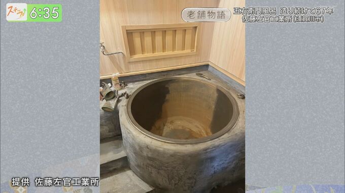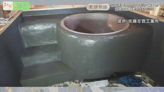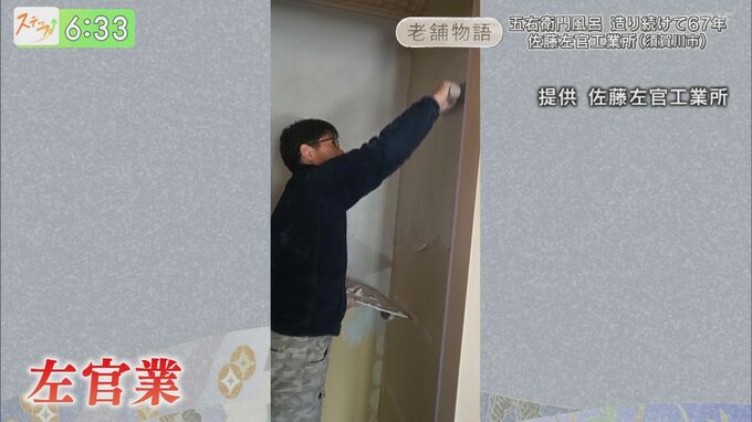 --佐藤和洋さん(佐藤左官工業所3代目)「丸いお風呂もありますが、ここに入ってるのは四角。見た目には普通の、ユニットバスとかそれと同じようなお風呂の形ですね。だから見た目にはあまりわからないんですけども。」
