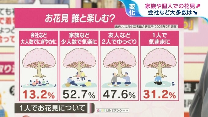 「1人が気楽だから」「マイペースにゆっくり桜を楽しめる」という声がありました。