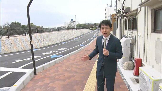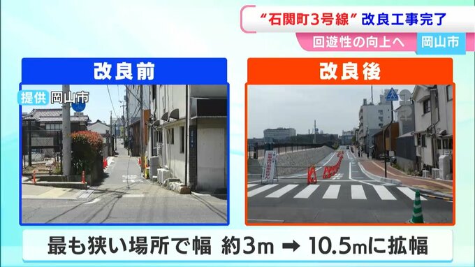 岡山市が通行時や洪水時の安全性の向上を目指し、まちづくり事業の一環として取り組んだもので、当時、建物があった場所などの民間の土地は市が買収。2013年度に着工し総事業費は約7億2千万円です。それまで狭いところで3メートルだった道路の幅は10.5メートルにまで広げられました。