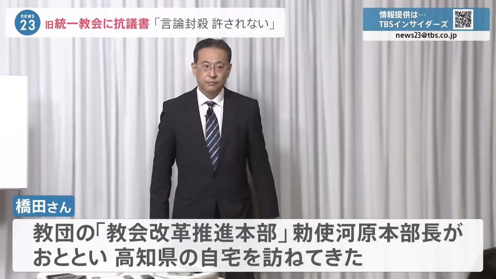 元妻による旧統一教会への高額献金などが原因で、家庭が崩壊し長男が自殺したという橋田達夫さん。18日、霞が関で記者会見を行いました。怒りの矛先は、教団の「教会改革推進本部」の勅使河原本部長が16日、突然、高知県の自宅を訪ねてきたことです。