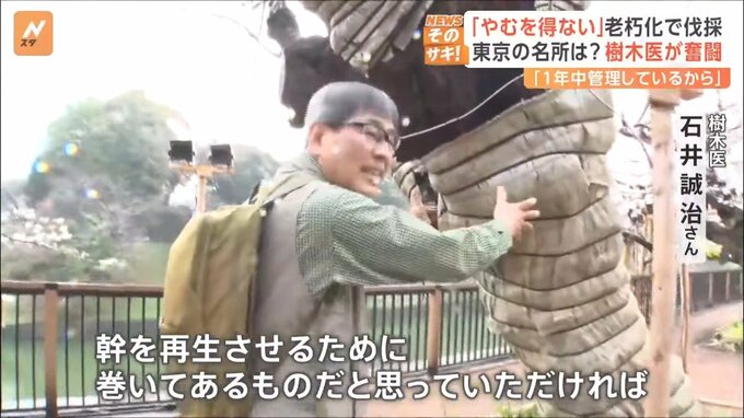 これらの桜を管理している樹木医の石井誠治さん。花が咲いているのは2週間ほどですが、病気の確認や害虫の駆除など、1年を通して桜と向き合っているといいます。