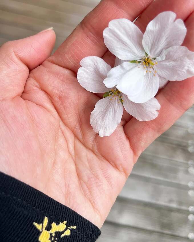 工藤さんは、手のひらの上の拾った花々の写真とともに、その花を唇のそばに添えた自撮りワンショットも投稿。「今年もお庭のソメイヨシノが見事に美しく咲いてくれました。会えてよかった」と感慨深げにテキスト。