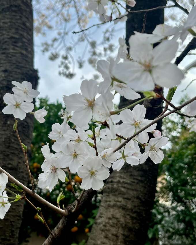 工藤さんは、枝に咲くソメイヨシノの花に寄った写真や、そびえたつソメイヨシノの樹を見上げる動画などを投稿。どれも、ほのかな桜色とその向こうの空の色が相まって、爽やかな春の光景となっています。