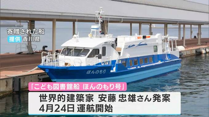 世界的建築家、安藤忠雄さん発案の「こども図書館ほんのもり号」です。寄贈された船にこれから本が積み込まれ、4月24日に運航が始まります。初日は安藤さんを招いて高松港で記念の式典が行われます。