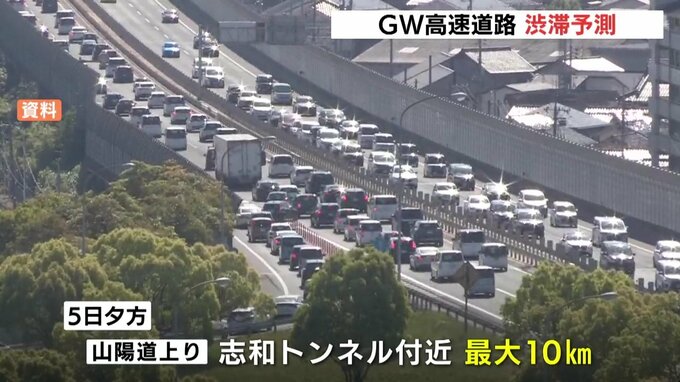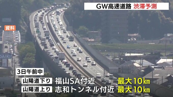 一方、5月3日から5日にかけては、広島市周辺の山陽道の上下線で10キロ以上の渋滞が見込まれています。