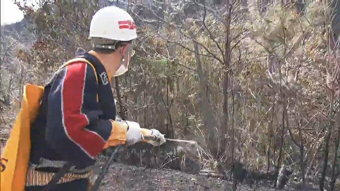 今月23日に発生し、きのう(28日)鎮圧が発表された岡山市南区の山林火災の現場では、鎮火を目指して残った火種を探しながら消して回る地道な作業がけさ(29日)から始まりました。