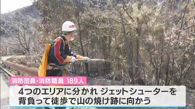 けさ、消防団員ら189人が4つのエリアに分かれ岡山市南区阿津から徒歩で山の焼け跡に向かいました。