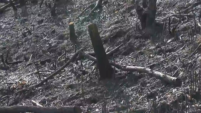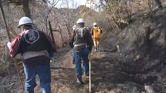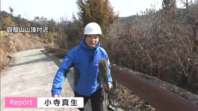 「貝殻山の山頂付近です。消防団員らが残り火を探していきます。山中は黒く焼け少し焦げ臭い匂いが残っています」