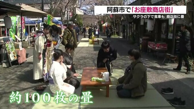熊本県阿蘇市で、通りに畳を敷き詰めて料理などを楽しむ「お座敷商店街」が開かれています。この「お座敷商店街」は、阿蘇市の門前町商店街が、桜の花と商店街の食を楽しんでもらおうと毎年、この時期に行っている…
