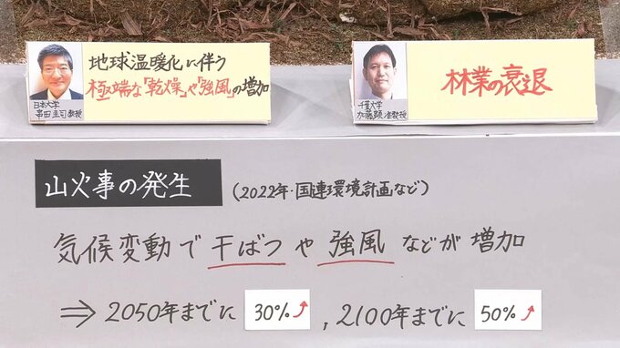 国連環境計画などの報告書によると、今後、地球温暖化を要因とする気候変動によって、干ばつや強風が増え、山火事の発生は2050年までに30%、2100年までに50%も増加するとされています。