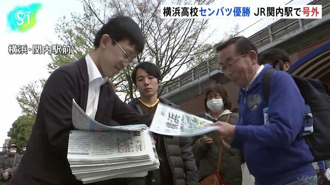 「横浜高校、センバツ、優勝です」きのう、選抜高校野球大会で神奈川県の横浜高校が優勝を遂げたことを受けて、JR関内駅前では地元紙の号外が配られました。号外を手にした人「ベイスターズが優勝して、次は横浜の…